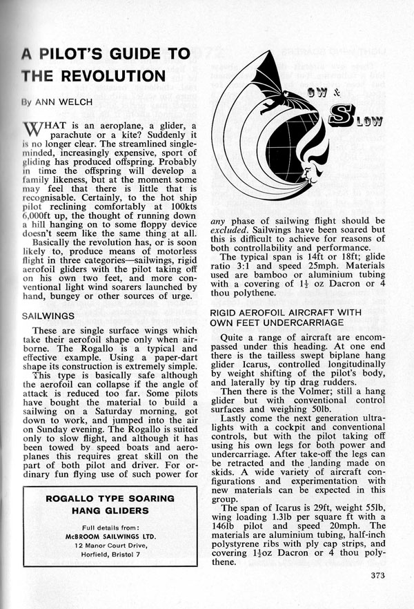 The following article 'A Pilot's Guide To The Revolution' by Anne Welch appeared in the October/November 1972 edition of 'Sailplane & Gliding' magazine, and gives basic account of how Anne has seen gliding's development over the years and where she thinks it might be going, especially by those's with a love of flying and a lack of money